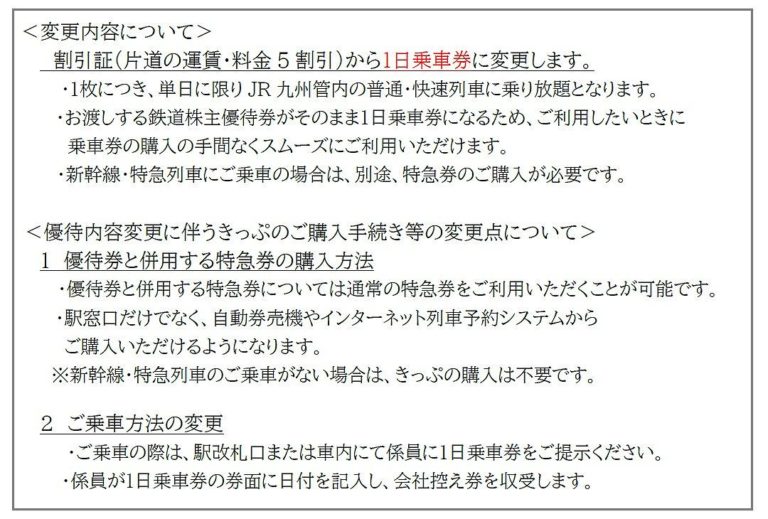 また、鉄道乗車券以外にも優待券としてアミュプラザなどで使える商品券が2,500円、博多と釜山を結ぶ高速船の割引券がありますが、こちらは一部の変更に留まります。
