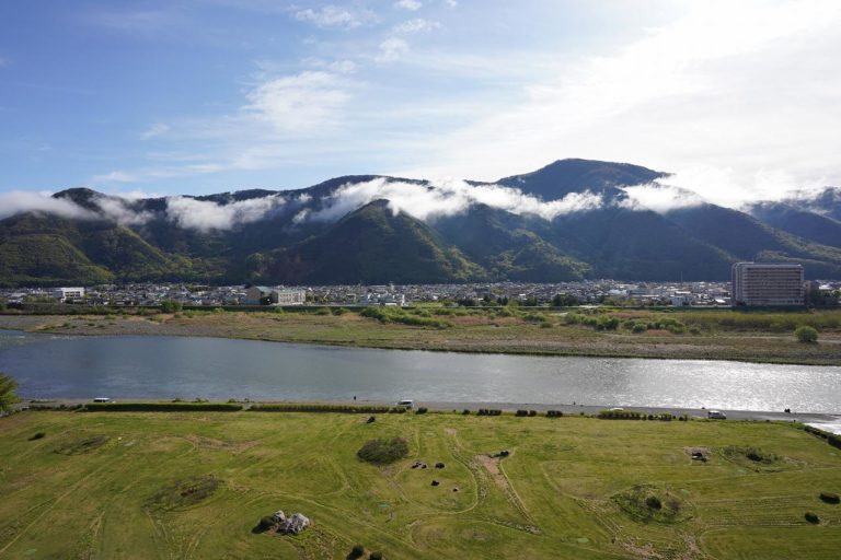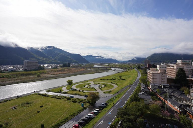 ホテル前の河川敷に降りると千曲川をゆったり眺められます。気温もちょうどよく、ゆったりと空と皮を眺めていたら時間が過ぎ去っていきそうな雰囲気です。