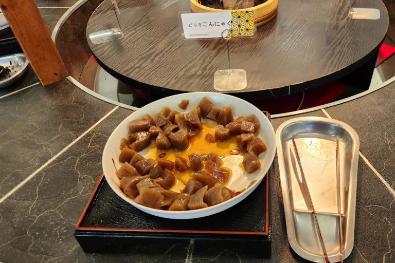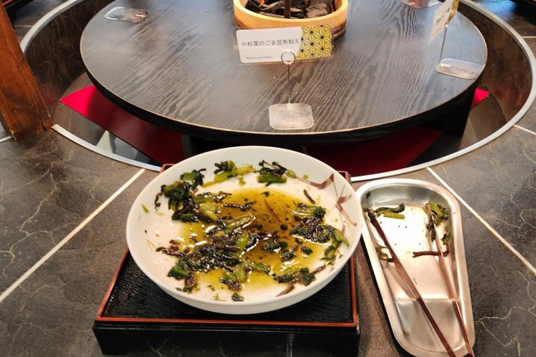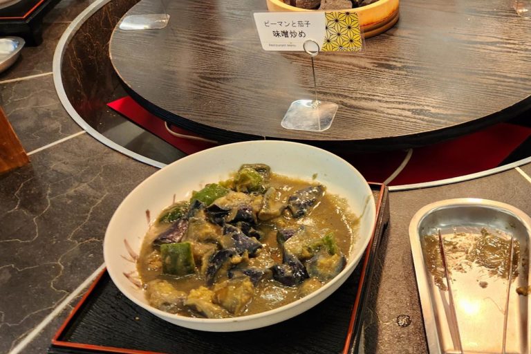 円形テーブルには和物や煮物、炒め物などが並びます。なすとピーマンの味噌炒めがあったのは好きだから嬉しい。