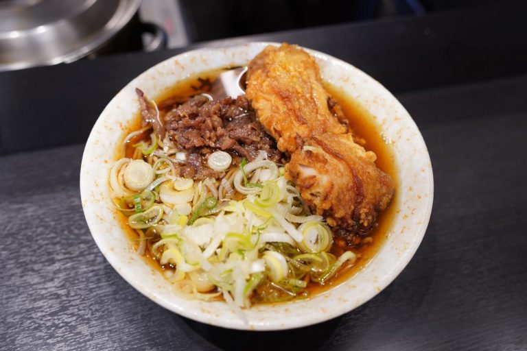 山賊そばというのは、信州名物の山賊焼きがデーンと乗ったそば。それに馬肉を乗せて、590円+240円で830円。駅そばとしては少し高めですが、大きな山賊焼きに味の染みた馬肉がたっぷり乗ってます。