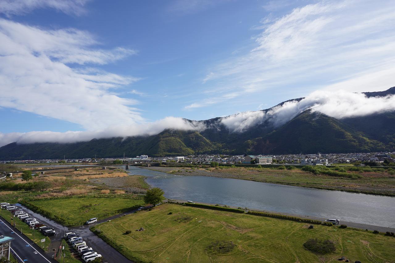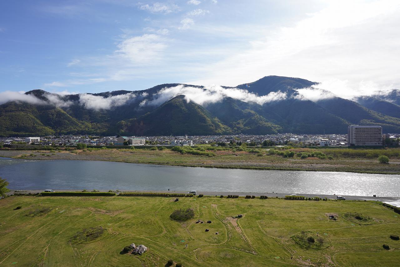 昨日はどんよりとしてたのですが、今朝は打って変わっていいお天気。部屋からも千曲川と山を一望できました。