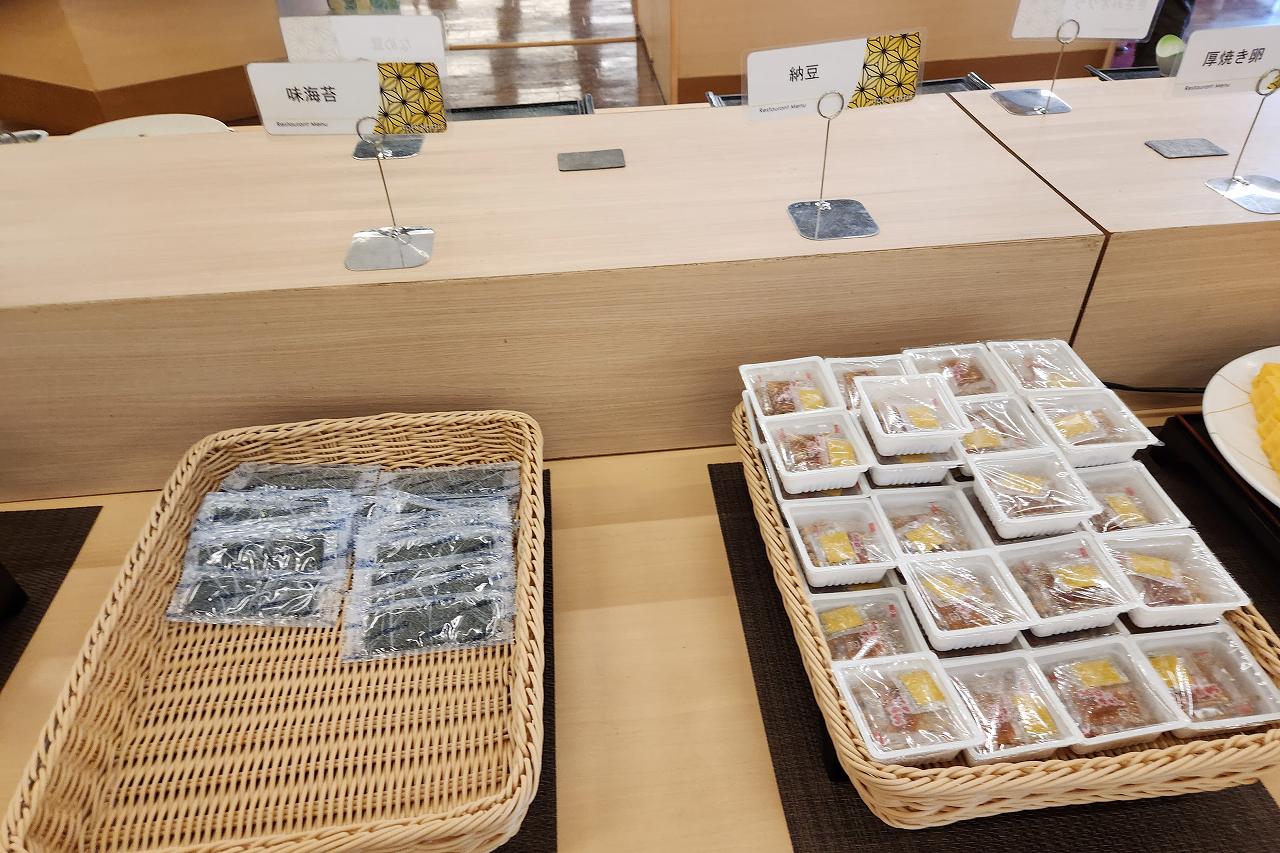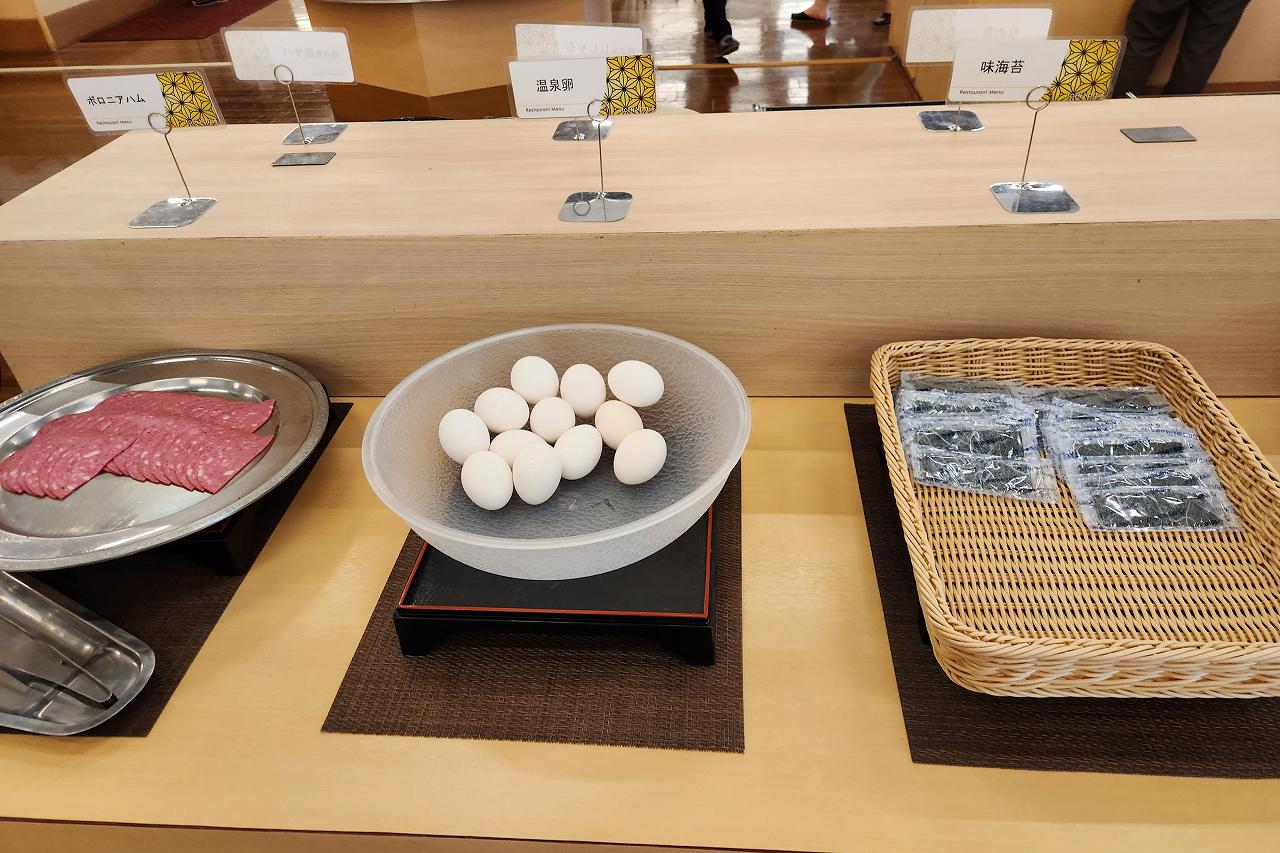 ハムに温泉たまご、焼きのりに納豆です。こういう温泉たまごって、小さな温泉旅館だったりすると自家源泉で作ってたりするんですが、きっと市販品なんだろうな。