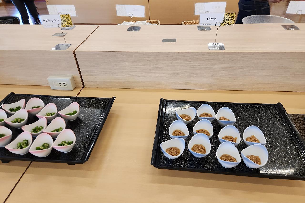 隣の小鉢に入っているのは、なめ茸にオクラ、松前漬けにごま昆布と温かいごはんに載せて食べたくなるおかずです。あとでのっけ丼みたいにしてみましょう。