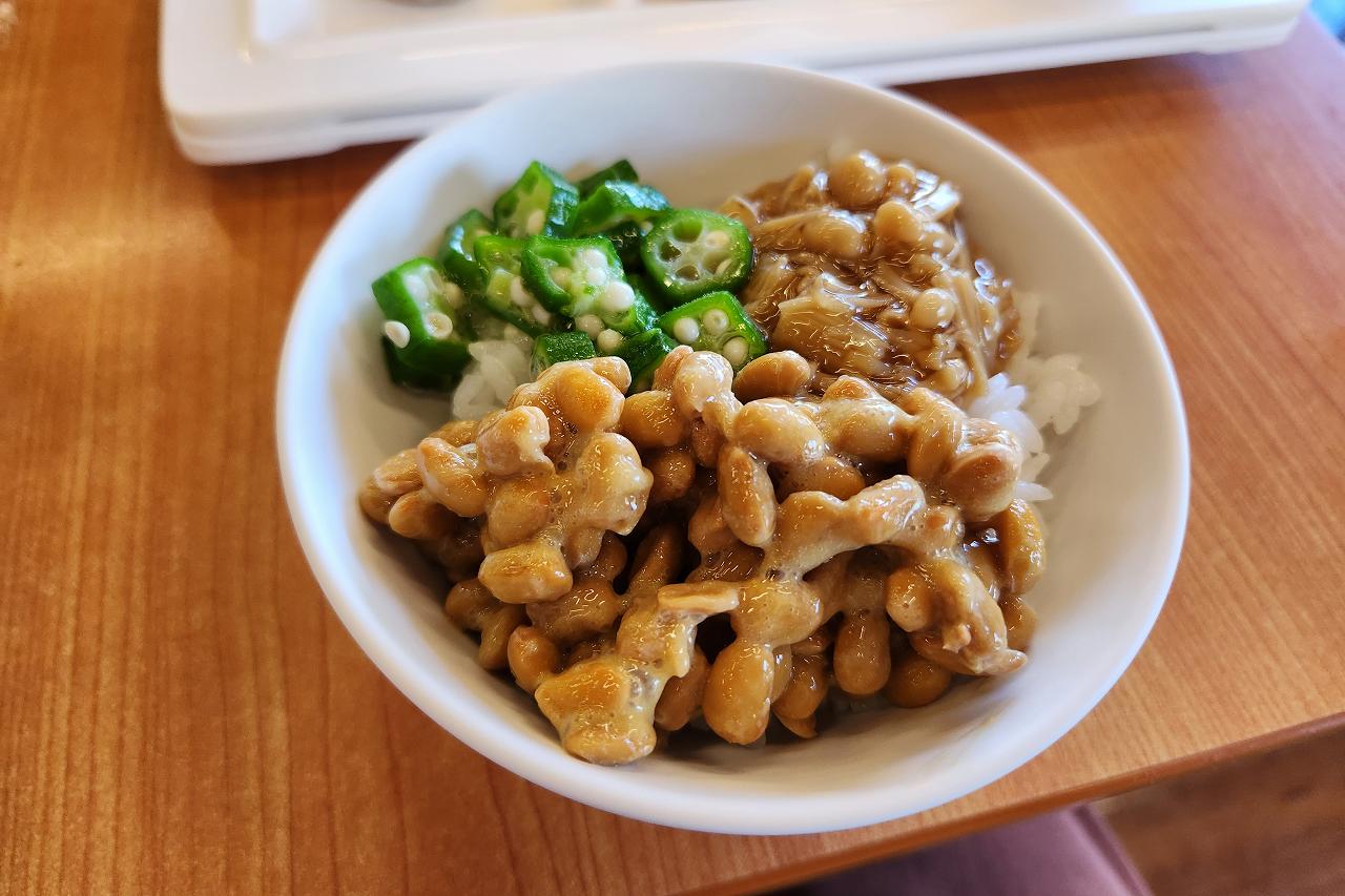 なめ茸とオクラを見ながら、納豆とともに乗せたいな〜〜!ってことてのっけ丼に。なんだかんだでこういうのが一番美味しいんですよね。