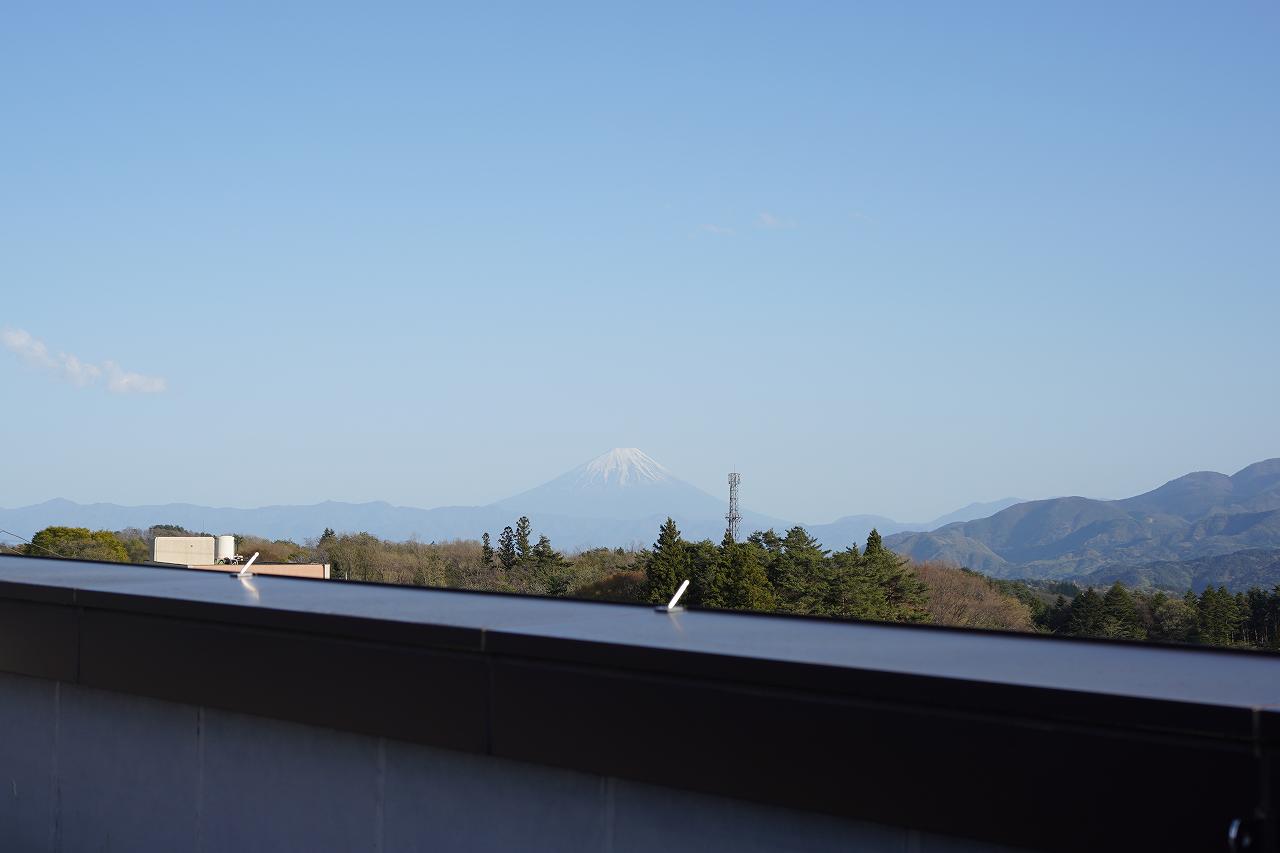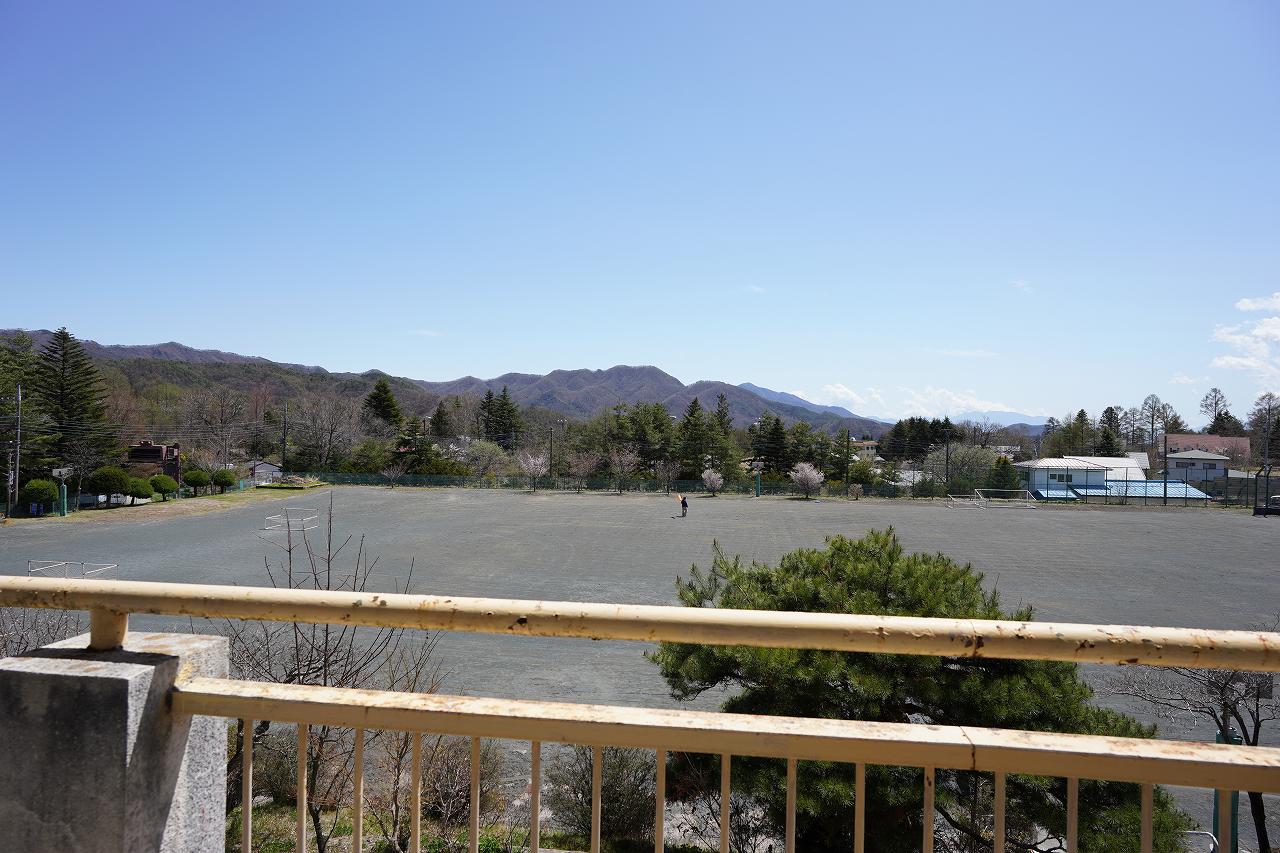 ベランダにも出ることができ、ベランダからは校庭と山々を眺められます。天気が良ければ奥に富士山が見られることも。