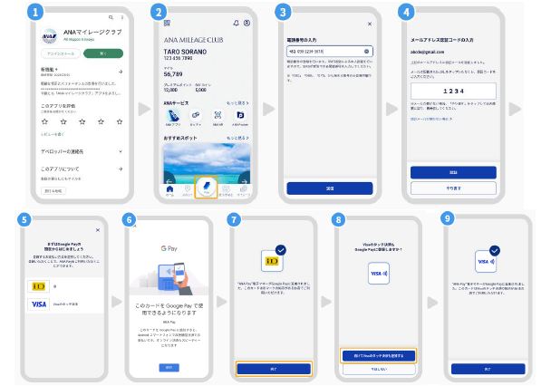 iOS版と同じく、Google Payを利用して「Visaのタッチ決済」と「iD」に加えて、バーチャルカードを用いたオンライン決済にも対応します。ANAマイルを1マイル単位で使用することができる他、利用額200円ごとに1マイルが貯まる決済アプリです。