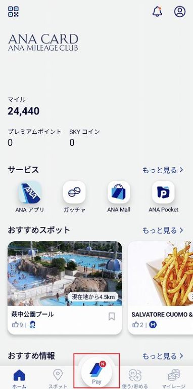 ANAマイレージアプリを立ち上げ、中央下部にある「Pay」ボタンをタップします。もしコード決済しか出てこない場合は、アプリのバージョンアップを確認しましょう。