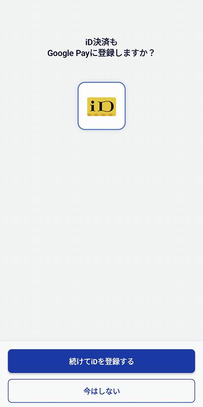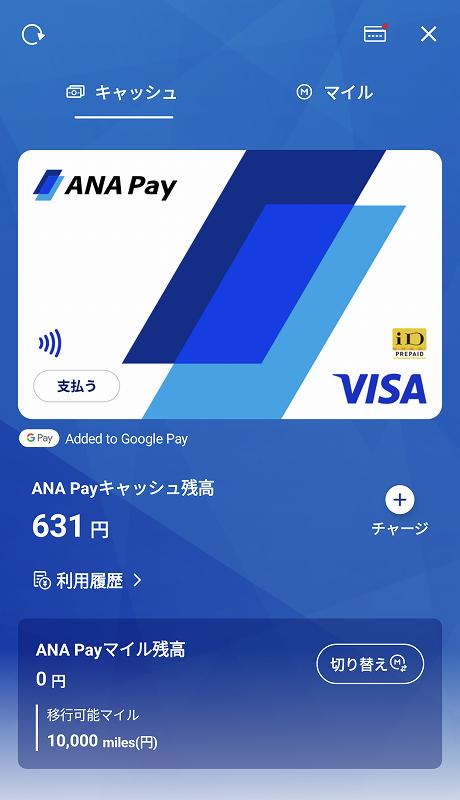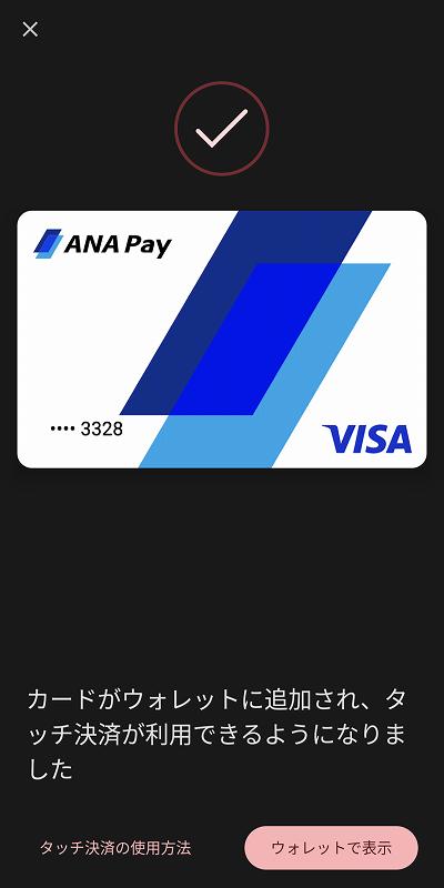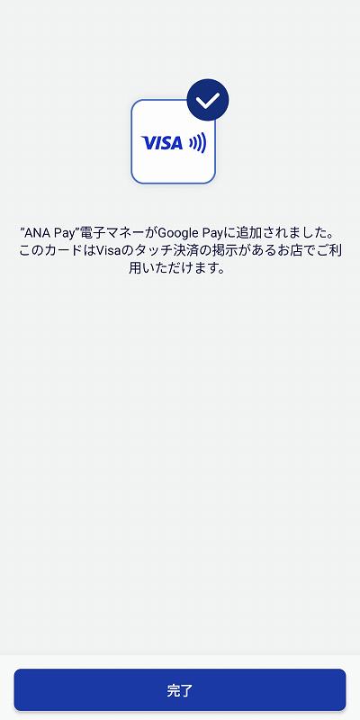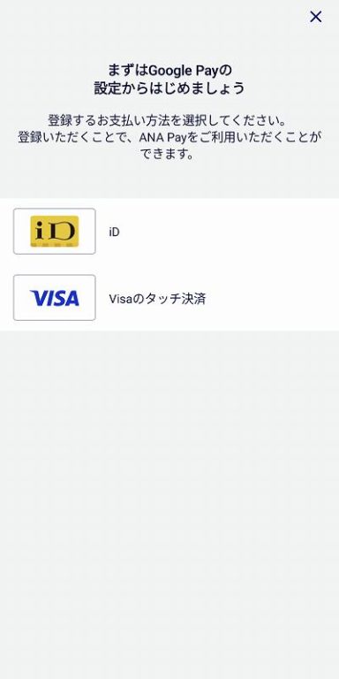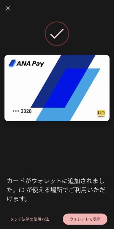 Google Payへの登録が完了すると、ANA Pay上の画面が変わり、Visaのタッチ決済とiDのロゴが表示されます。ここまで来たら設定は完了です。
