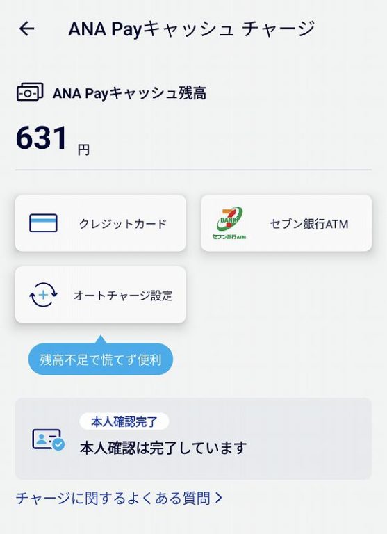 ANA Payへのチャージ方法としては、クレジットカードかセブンATMが用意されています。VisaやMastercardのほか、JCBでもチャージできるのはVisaプリペイドカードにしては珍しい印象です。