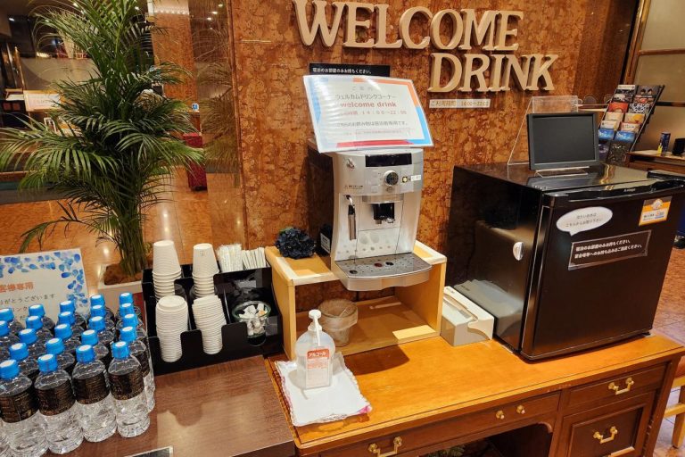 ウェルカムドリンク。コーヒーの他にもミネラルウォーターが提供されています。