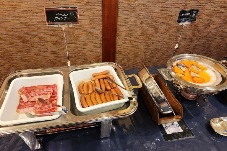ベーコンとウインナー、鮭の塩焼きといった定番のバイキングメニューも並んでいます。