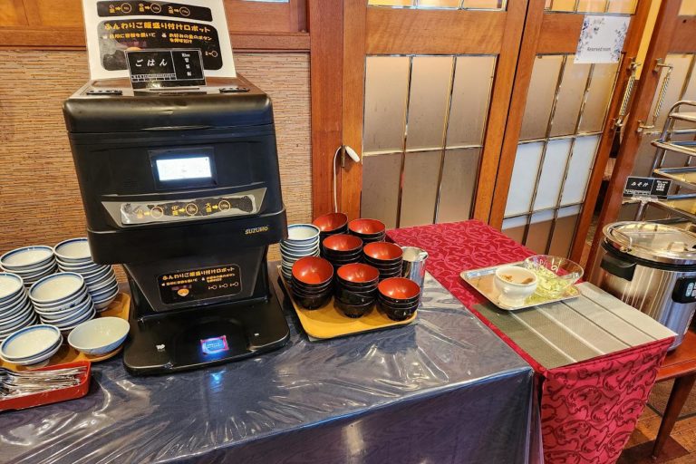 ご飯とお味噌汁。ごはんはボタンを押すと定量がでてくるという機械が盛り付けてくれる仕組み。やよい軒にある盛り付けマシーンを思い出します。