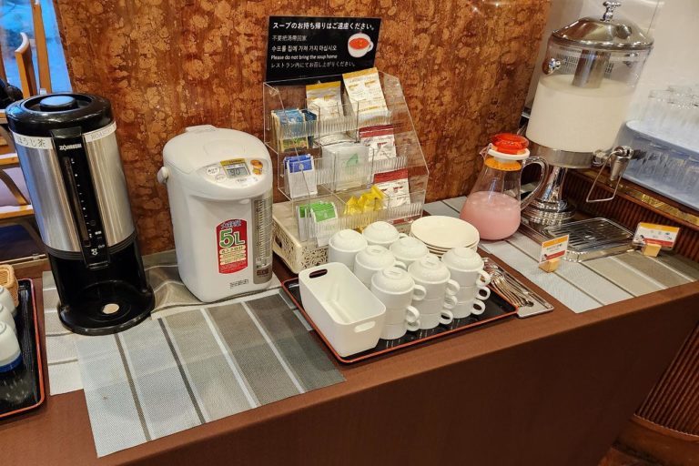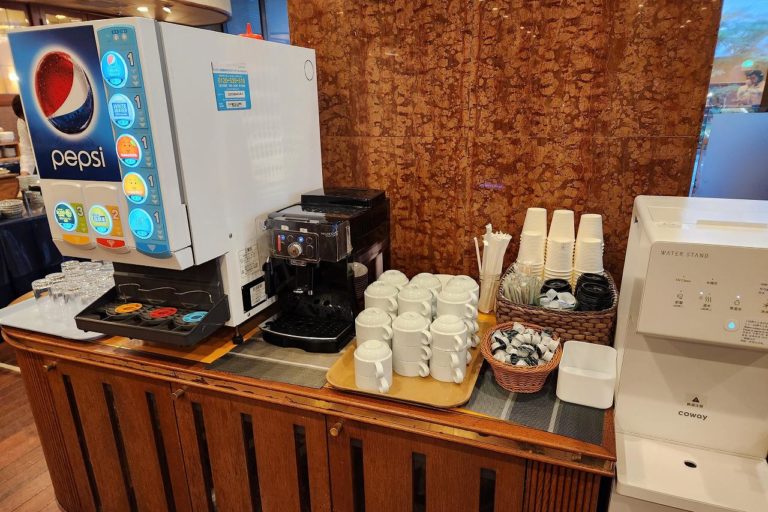 最後にドリンクコーナー。スープにドリンクバー、コーヒーメーカーなどが設置されており、コーヒーは部屋に持ち帰ることができます。