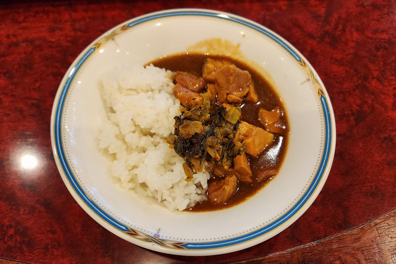 チキンカレーの辛子高菜乗せ。思ったよりも辛味が少ない辛子高菜でした。カレーは鶏肉がゴロゴロ入っていて食べごたえも十分です。ごちそうさまでした。