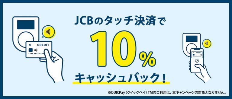 Visaのタッチ決済に比べると知名度が微妙な印象のJCBのタッチ決済ですが、今回JCB発行のカード限定で10%還元されるキャンペーンが実施されています。対象店舗は微妙ではありますが、三井住友カードよりも還元率が高い場合は使い分けも良さそうです。