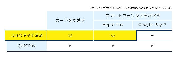 なお今回のキャンペーン対象は「JCBのタッチ決済」ということで、カードをかざすかApple Payでの利用のみが対象となります。同じ非接触決済でもQUICPayは対象外となっているので注意しましょう。(Google PayではQUICPayしか登録できないので対象外)