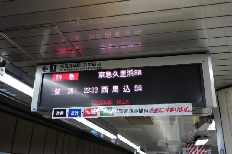 京成本線の遅れの影響により、都営浅草線に来る電車も遅延中。時間が書いてないので何時の電車かもわからないのですが、時刻表から想定すると23時04分発みたい。15分程度遅れているようです。