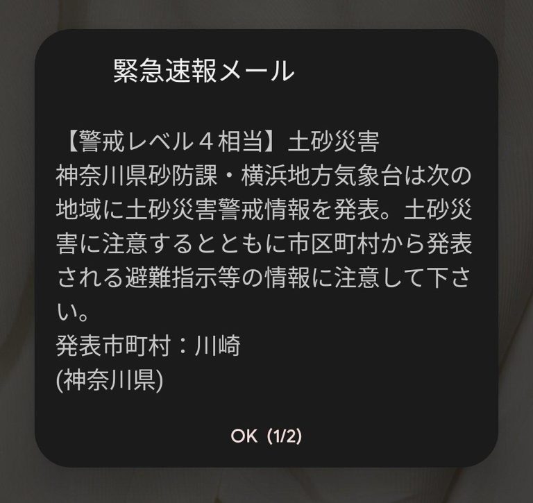 いきなり音が鳴り響いたと思ったら、川崎からの土砂災害の警告アラート。地域によってはなりっぱなしだったみたいで、ゆっくり寝られる状況でもなかったみたいです。