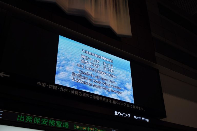 保安検査場に着いたのですが、上のモニターには保安検査場の開始時刻が記載。まだ5時10分くらいだったので、もう少しお預けのようです。こんな表示は初めて見たので、野宿したのも無意味じゃなかったのかもしれません。