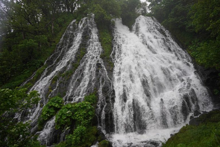 こちらがオシンコシンの滝の全貌です。扇のように流れ落ちていて、迫力満点の滝でした。知床に行くときにあるので、行きか帰りかどっちかに寄り道してみることをおすすめ。トイレ休憩にも良いかもしれません。