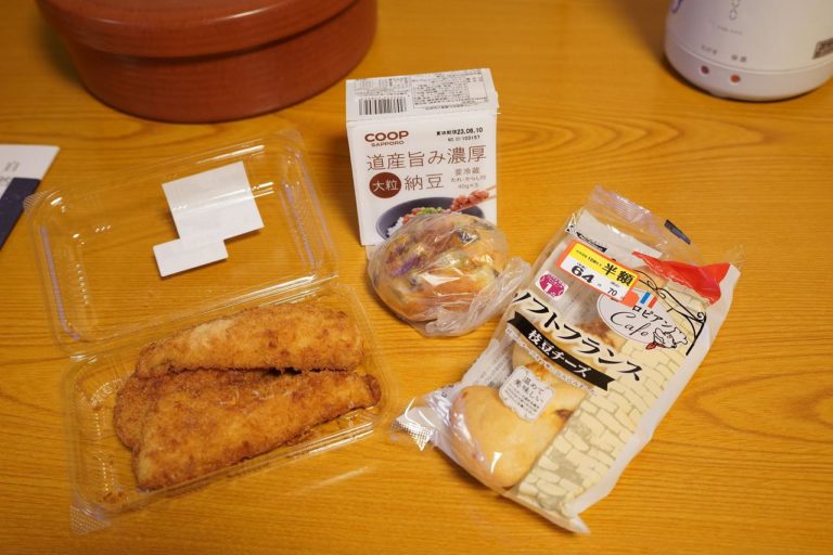 今日の宿泊は朝食付き。ということで、夕食はスーパーで買って来たパンやホッケフライなどを食べてました。明日の朝ごはんが美味しいと評判なので、あまり食べ過ぎないようにしておかないとと思ったけども結構お腹いっぱいになってしまいました。