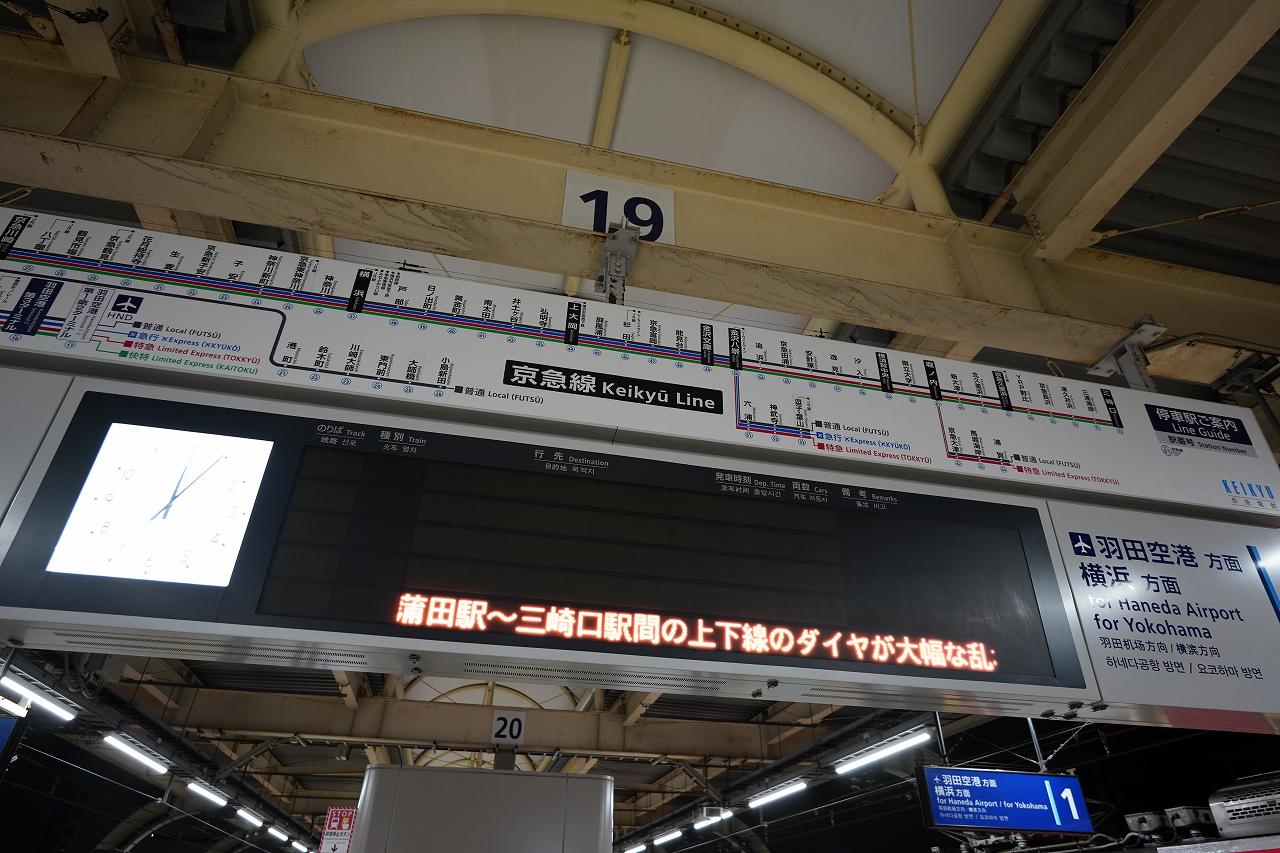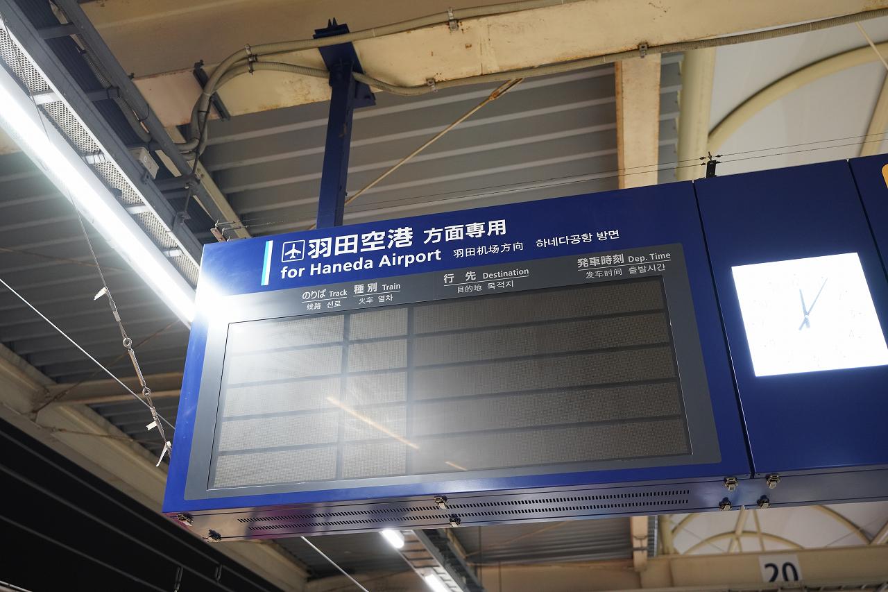 電光掲示板を見ても、列車の情報は何も書いてありません。なのでとりあえず羽田空港方面と書かれたホームで佇んでいると、「\羽田空港行きは下のホーム4番線から発車します/」というアナウンスが。ホームで待っていた人と共に、下の階へ移動することに。