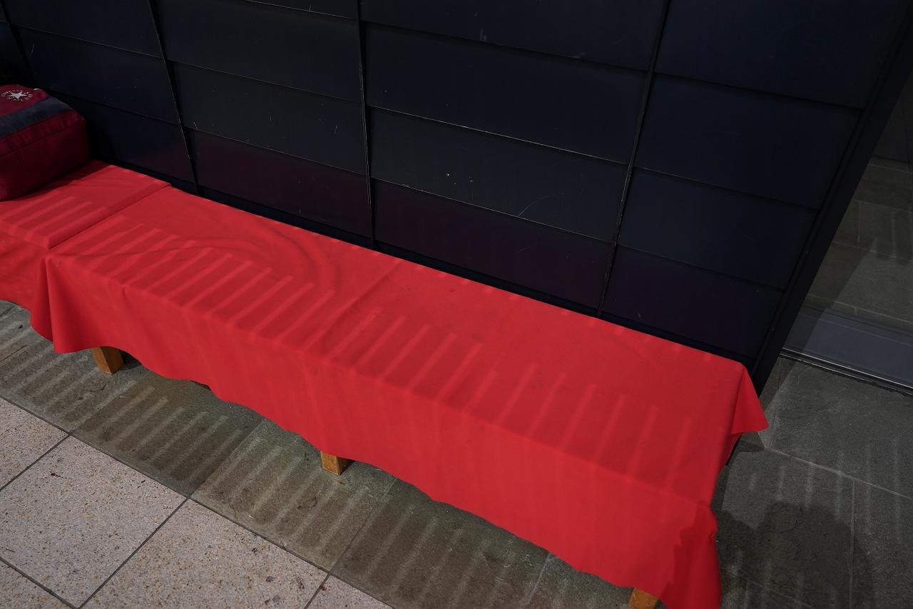なお、本日の宿はこちら(?)そこらへんのベンチです。深夜の羽田空港ではこういうベンチが争奪戦となっており、寝転がって寝ている人をたくさん見ます。なので寝てても怒られません。