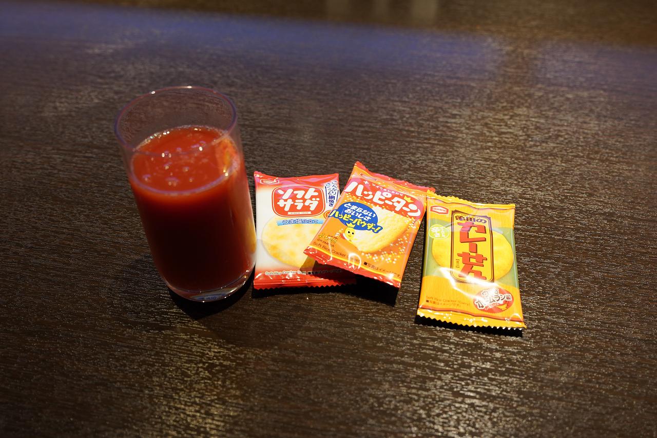 他にもお菓子としてハッピーターンなどの提供があります。このお菓子って前はオリジナルのおかきだったんですが、そっちに戻してほしい。