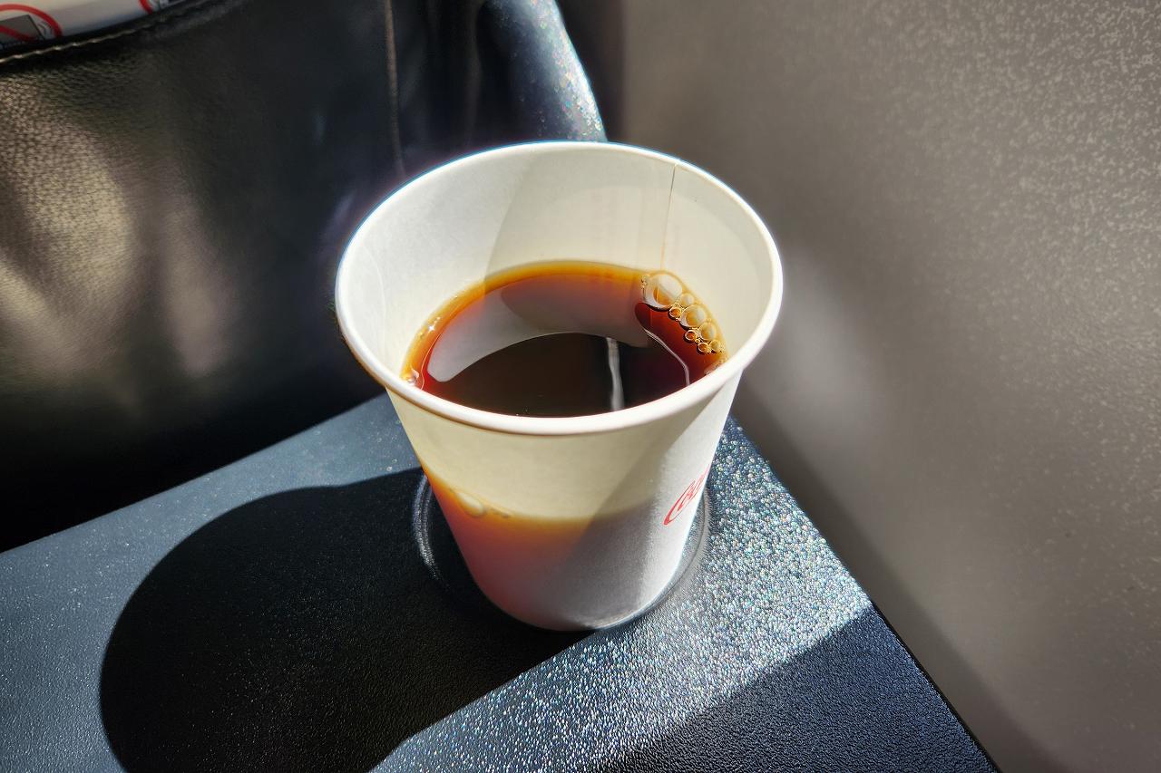 眠気覚ましにアイスコーヒー。JALはアイスのコーヒーがあるから嬉しいんですよね。機内ドリンクとしてはANAよりもJALです。