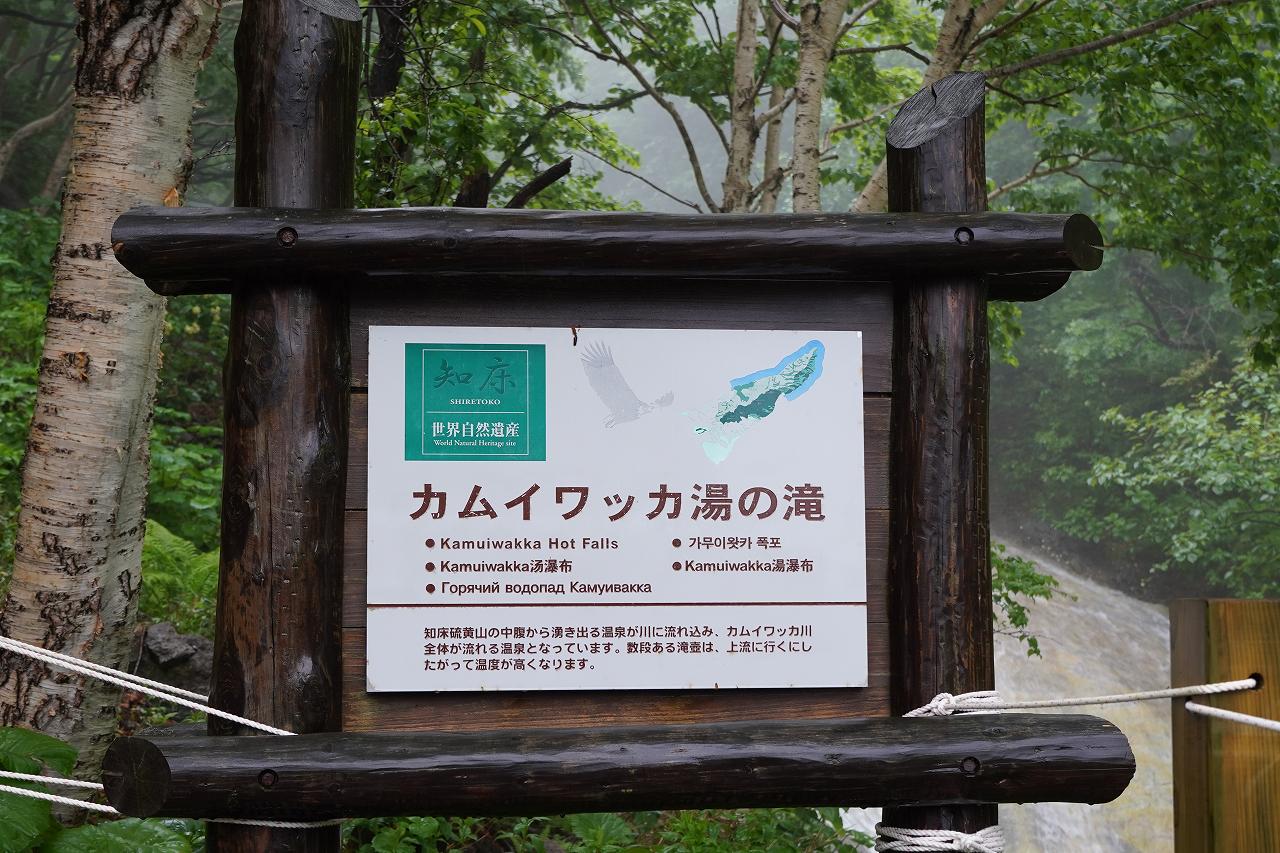 こちらがカムイワッカの湯の滝のほう。黄色く見えるのは滝が硫黄泉だからで、30度程度のぬるま湯の川になっています。今までは6月からは自由に入れたのですが、今年からは7月からに変更の上で有料になるらしい。