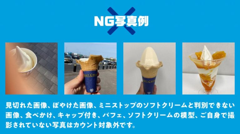 NG例としては、ソフトクリームがはっきり写ってなかったり食べかけだったり、ミニストップのソフトクリームと判断できないもの。食べる前に写真を撮りましょう。