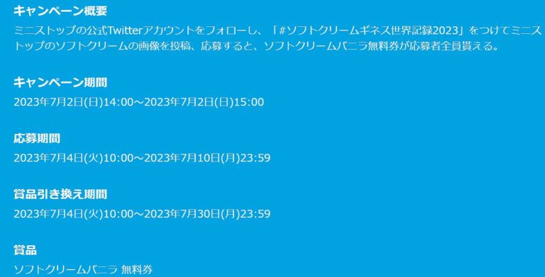 そしてキャンペーン開催時間「2023年7月2日の14時〜15時」に「#ソフトクリームギネス世界記録2023」というハッシュタグを付けてソフトクリームの写真を投稿するだけ。