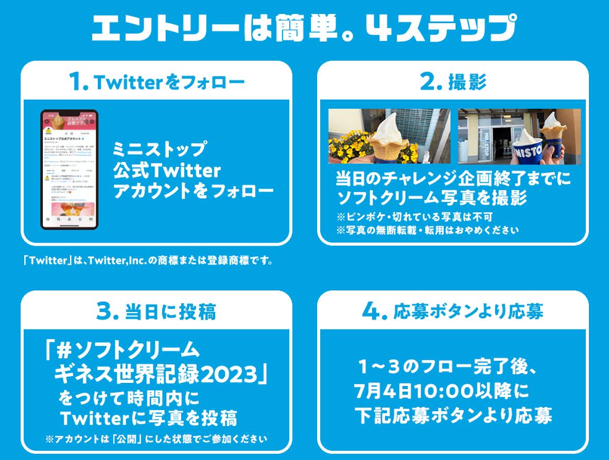 キャンペーンに参加するのは簡単。事前に行うことはTwitterのミニストップ公式アカウントをフォローすることと、ミニストップのソフトクリームの写真を撮影すること。(ソフトクリームはキャンペーン開催時点に食べる必要はありません)