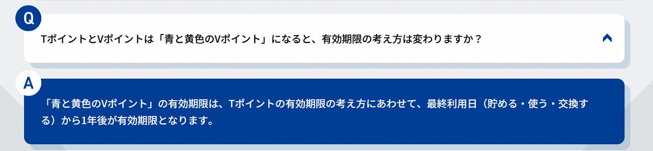 VポイントとTポイントが統合するということで、気になるのはポイントの有効期限。Tポイントは使えば1年後まで期限が伸びていきますが、Vポイントは付与時点ごとに有効期限が設定されています。