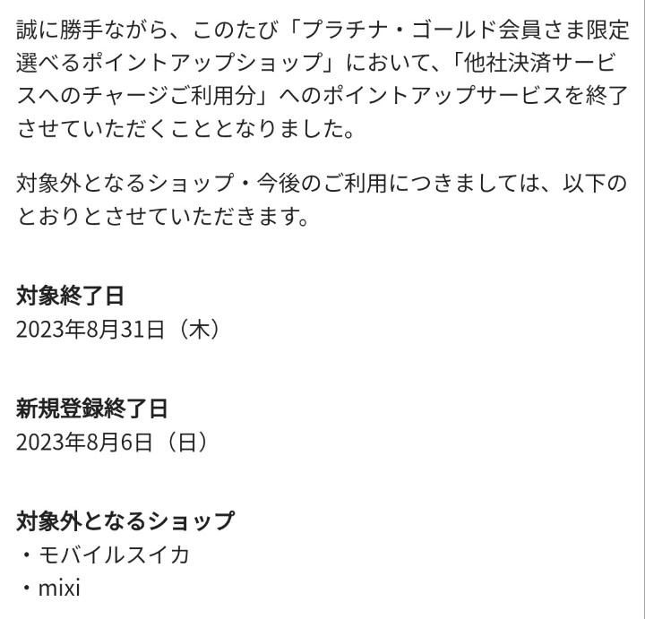 そんな特典でしたが、2023年8月31日で「モバイルスイカ」と「MIXI」がポイントアップの対象外に。しかし他社決済サービスへのチャージご利用分と記載があることを考えると、完全にMIXI Mを認知したリリースとなっています。