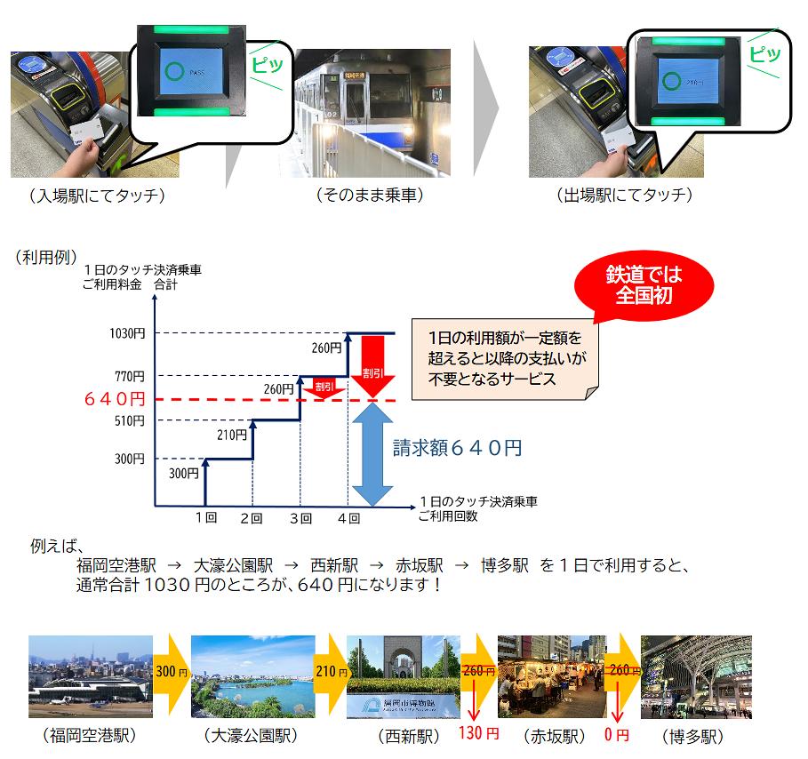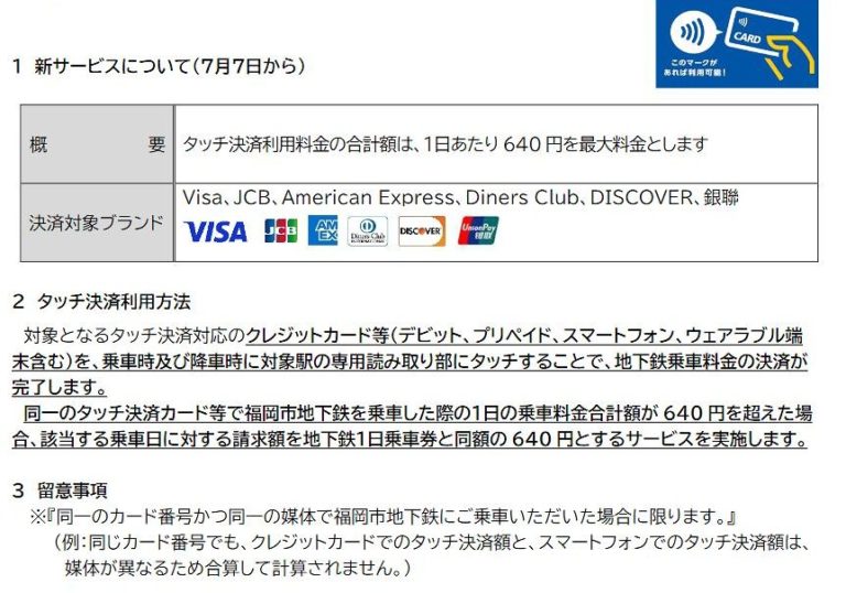 今回設定される「640円」というのは、福岡市営地下鉄の一日券と同額の設定です。こういう一日券って買うかどうか迷ったりすることも多いですが、タッチ決済なら勝手に適用されるので悩まなくて済むのは便利なサービスです。