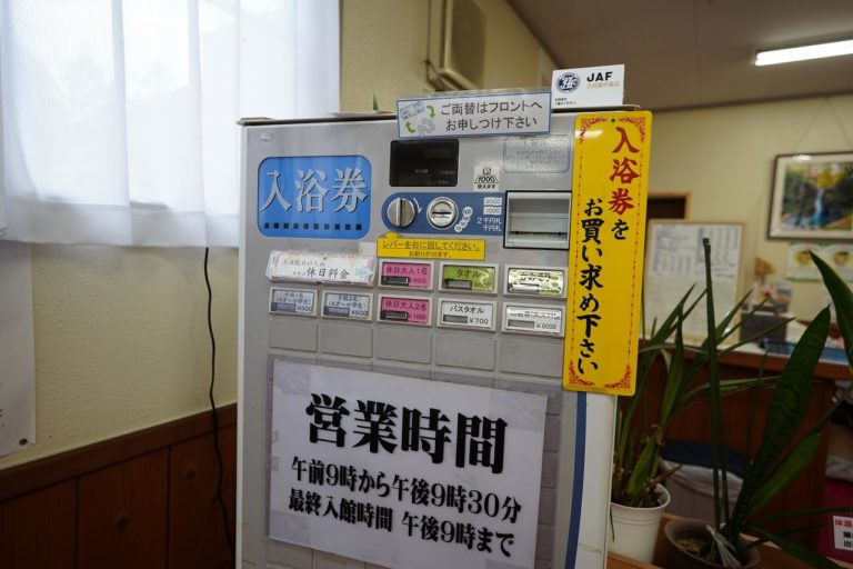 入口に入浴券のことが書いてあったのですが、「部落内の商店」という書き方がされています。部落と聞くと差別用語のように感じる人も居ると思いますが、単純に集落という意味で使われていることも知っておくと良いと思います。