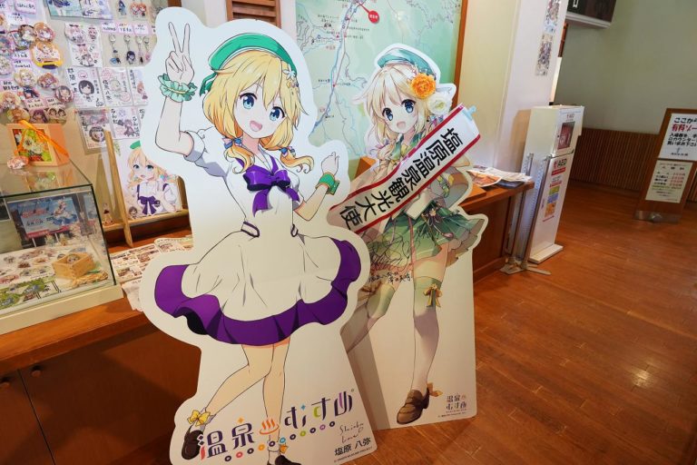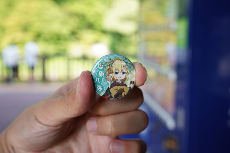 もの語り館の中では塩原温泉の温泉むすめ「塩原八弥ちゃん」のパネルが飾られています。気になったので缶バッチのガチャもやってみました。小さくてかわいい八弥ちゃんのバッチをゲット。
