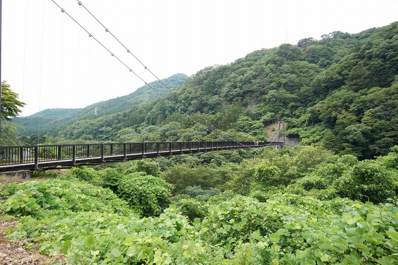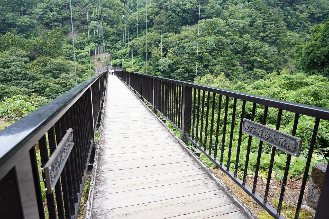 出発する前に立ち寄ったのが、ホテルの目の前にある大きなつり橋「鬼怒楯岩大吊橋」です。この橋からは鬼怒川の渓谷を眺めることができ、観光スポットとして多くの人が訪れる人気スポットです。吊り橋なので乗るとゆらゆら。高所なこともあって若干怖さを感じつつも先に進みます。