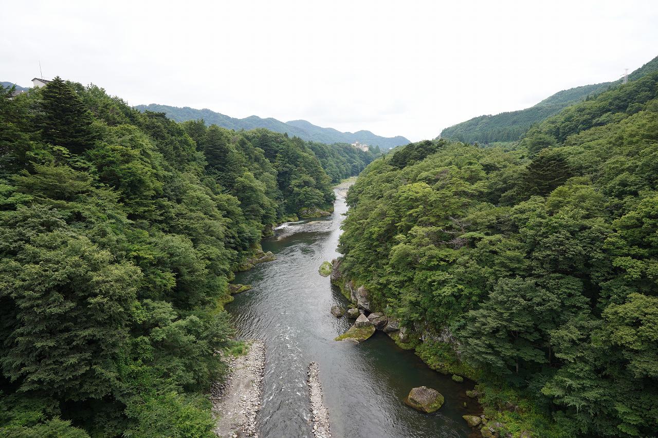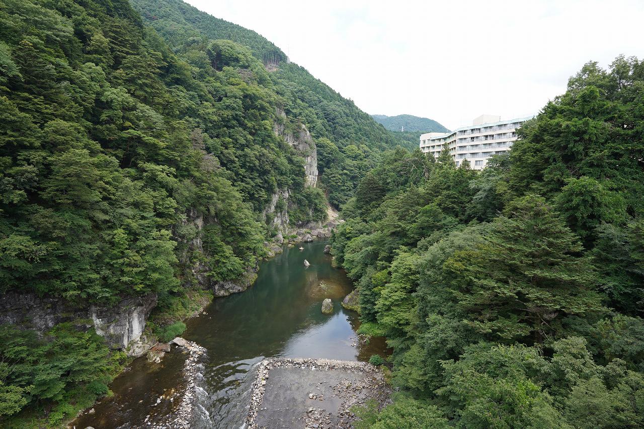 中心部には川を眺められる展望台が設置されており、左右に鬼怒川の渓谷を楽しむことができます。今日は晴天というほどでもなかったのですが、あまり暑くなくゆったりと眺められて良かったです。とはいえ龍王峡を知っていると物足りなさが感じるけどね。
