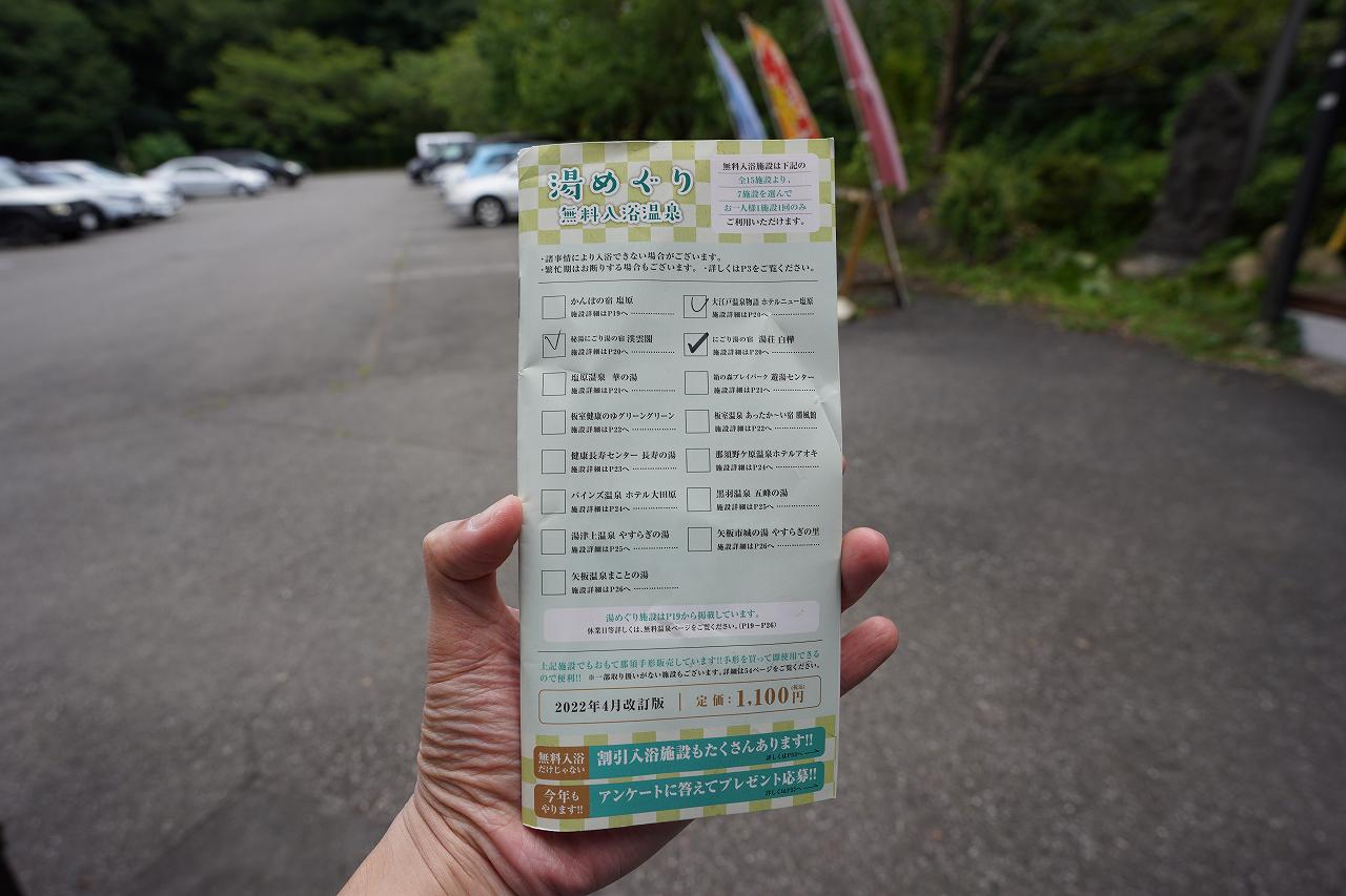 その秘密はおもて那須手形という那須塩原の温泉がいろいろ無料で入れるお得なチケット。1年前の2022年9月に購入していたのですが、有効期限が残っていたので使いに来たという感じです。てかこの手形が1,000円なのに、1,000円する日帰り入浴にも入れるというのはちょっと謎です。