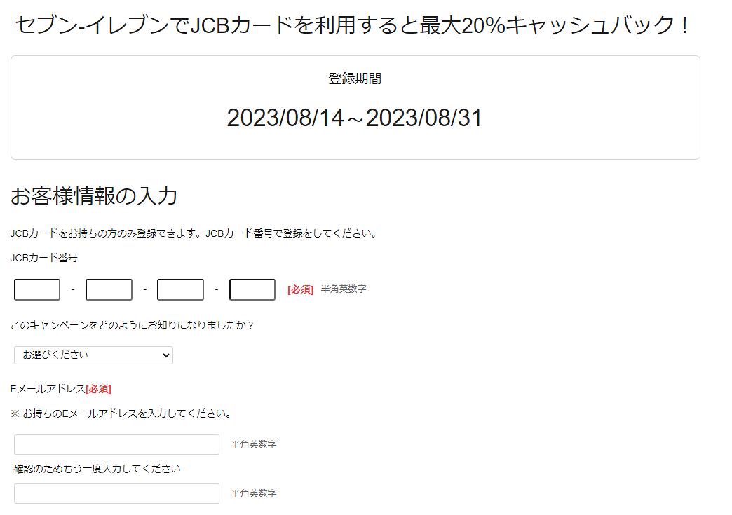 エントリーは各カード会社ではなく、JCBのキャンペーンページからの登録。カード番号の入力が必要となりますが、有効期限やセキュリティコードの入力は不要です。