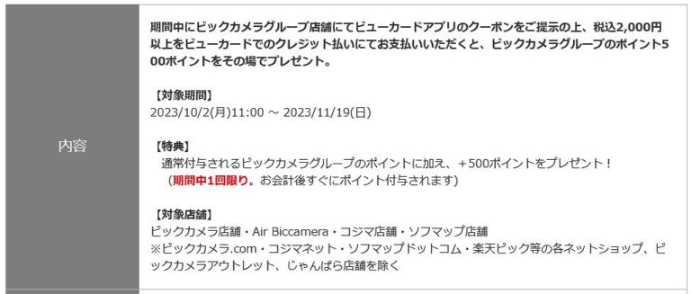 ビックカメラではビューカードで2,000円以上使うと500ポイントをプレゼントするキャンペーンをビューカードアプリ限定で実施しています。
