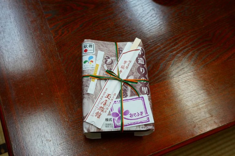 そして帰り際にいただいたのがお弁当。今回は名物のしゃも弁当が付いてくるプランを予約したので、実質的に夜・朝・昼の3食付き!さすがに昨晩の夕食に+αされても食べきれないので、お弁当がいただけるのは嬉しい。