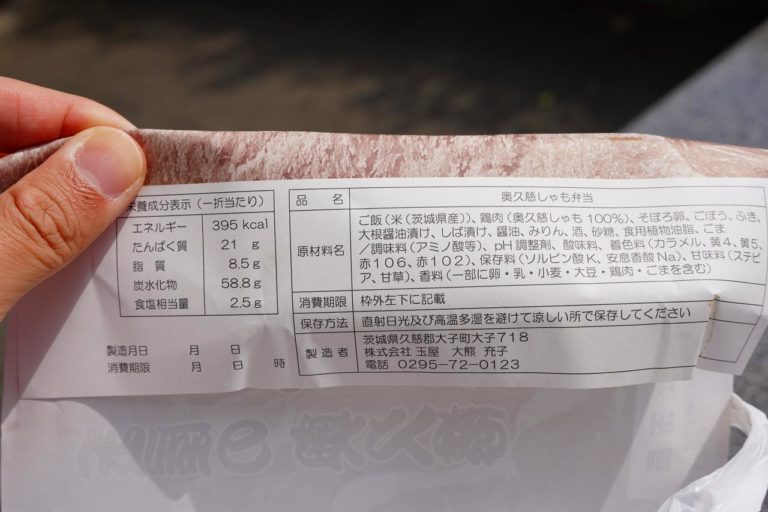 紙を取ると黒い紅葉柄のお弁当箱が登場。紙に書かれた原材料を見ると茨城県産のお米に奥久慈しゃも100%を使ったお弁当と記載がありました。これこそ地産地消ですね。
