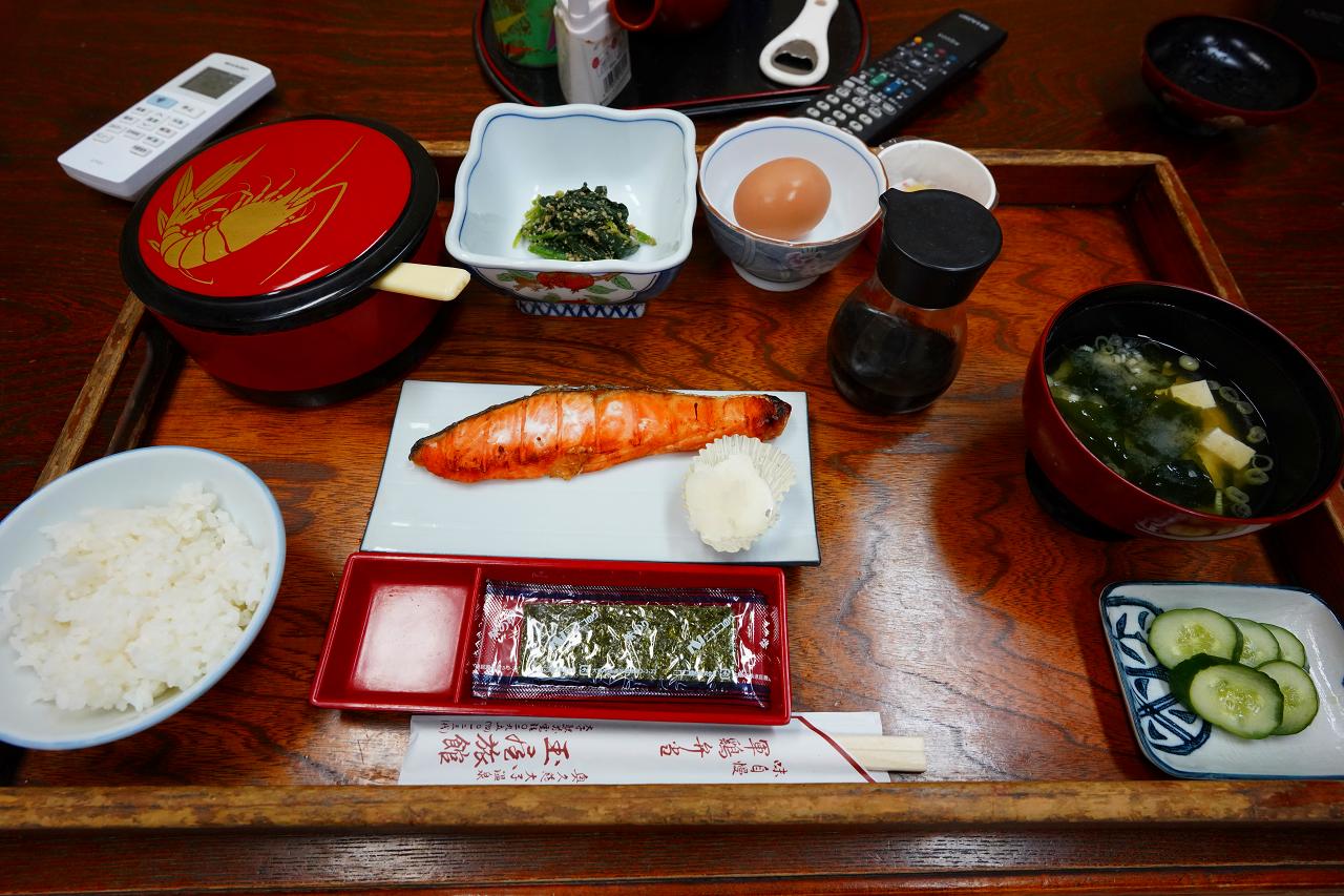 むにゃむにゃ寝ていたら朝食の時間。朝食は部屋食でした。ラインナップとしては焼き鮭に納豆、卵に焼きのりと、ごくごく一般的な和定食という雰囲気です。ごちそうさまでした。