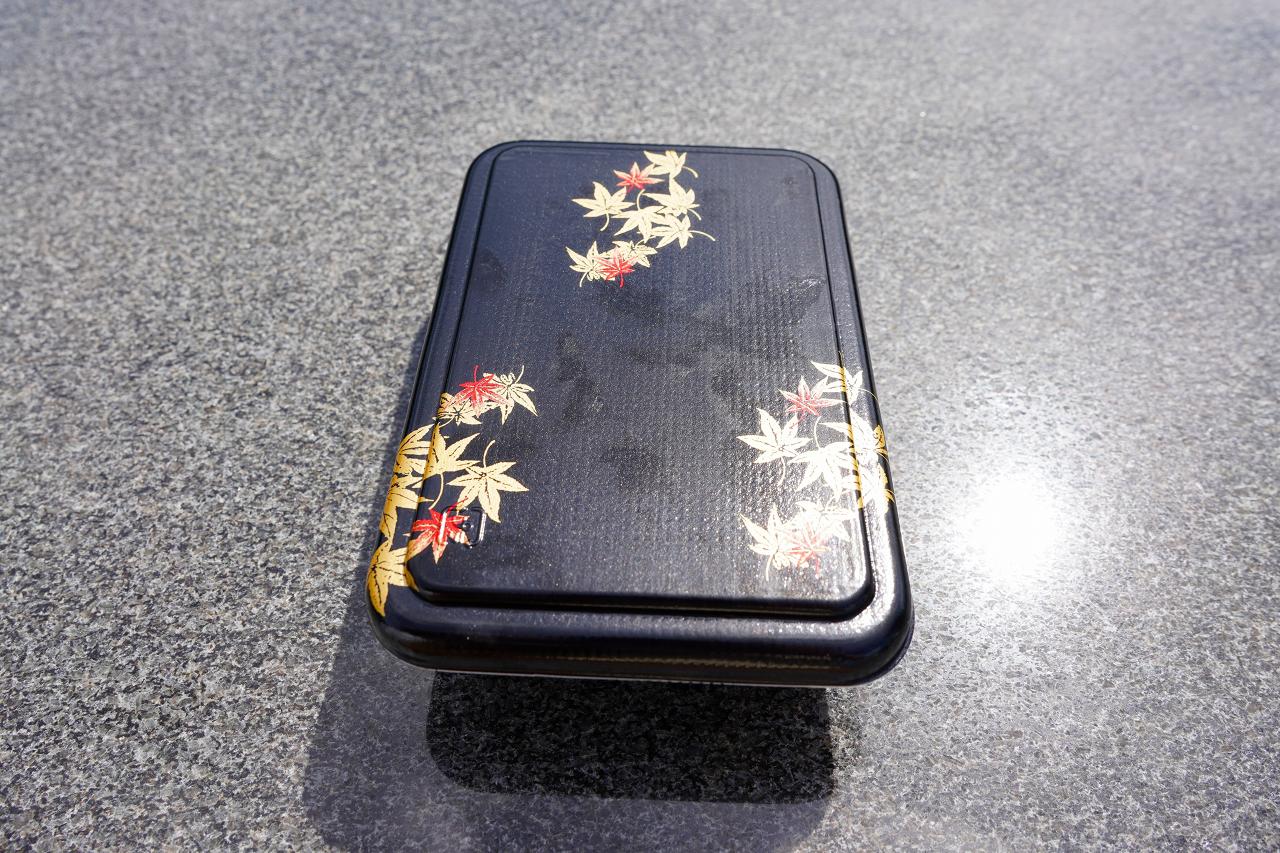 紙を取ると黒い紅葉柄のお弁当箱が登場。紙に書かれた原材料を見ると茨城県産のお米に奥久慈しゃも100%を使ったお弁当と記載がありました。これこそ地産地消ですね。