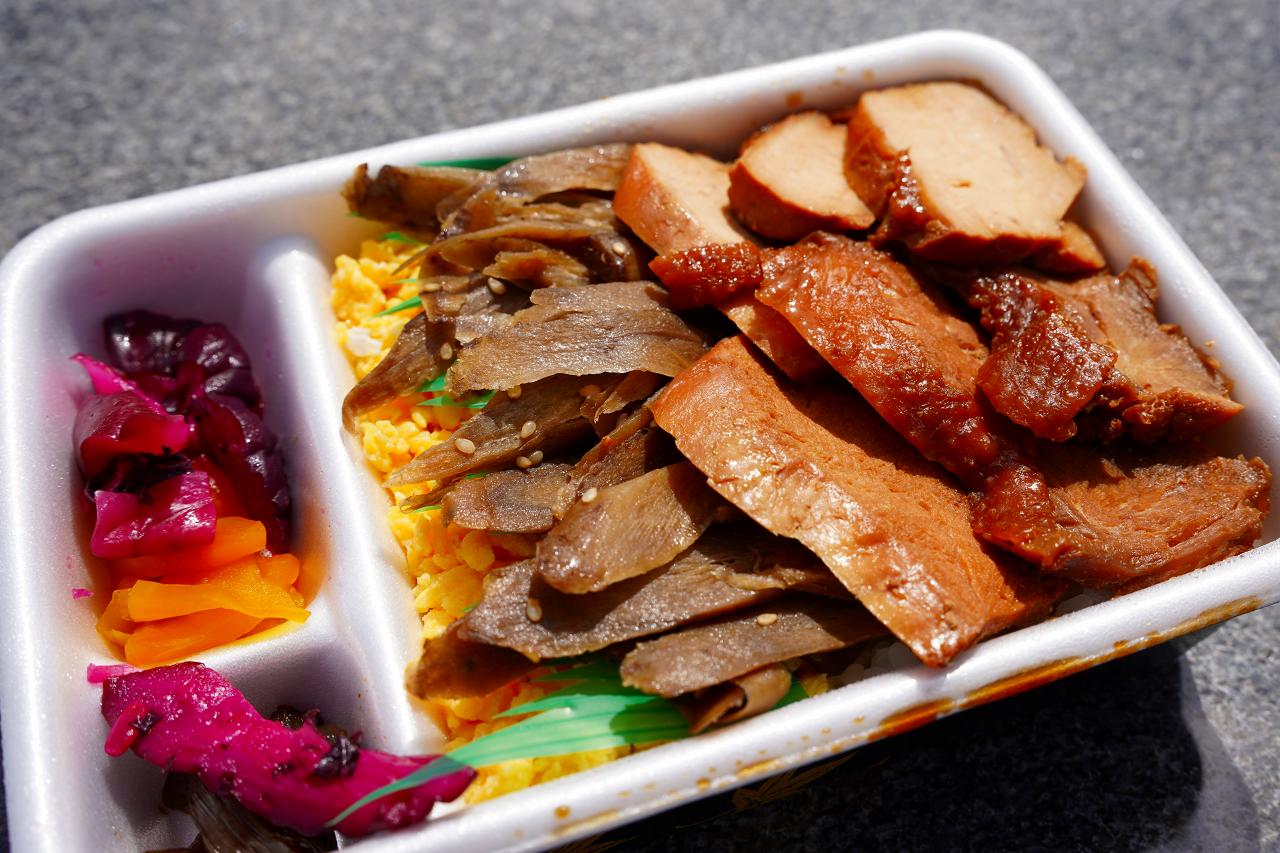 オープン……どーん!お弁当の中には笹切りにしたごぼうと、たっぷりの甘く煮込まれた奥久慈しゃも肉が載せられています。そしてその下には炒り卵が乗っており、想像以上にボリューミーなお弁当です。付け合わせにおしんこもあるので、口直しにもぴったりです。