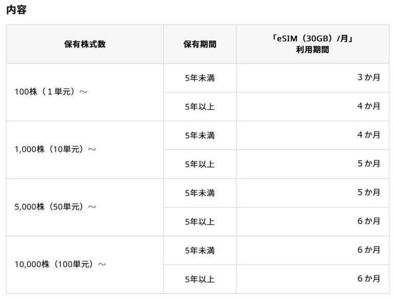 eSIMは1か月30GBと比較的大容量。保有株数と保有年数に応じて利用期間が異なりますが、例として5年未満の1単元では3か月利用可能なeSIMと引き換え可能です。
