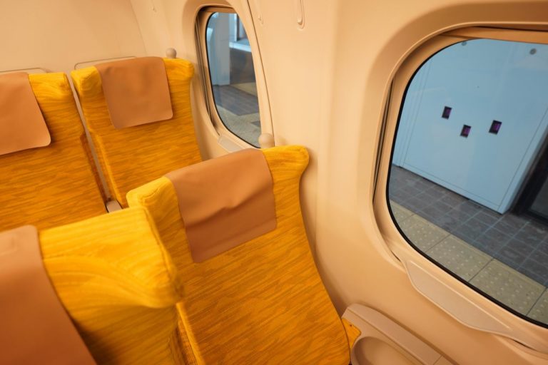 めちゃくちゃ倒れる自由席の座席。後ろの人のテーブルまで見えるくらいに倒れるんですが、居なきゃいいけど人が居たら気まずくなりそう。